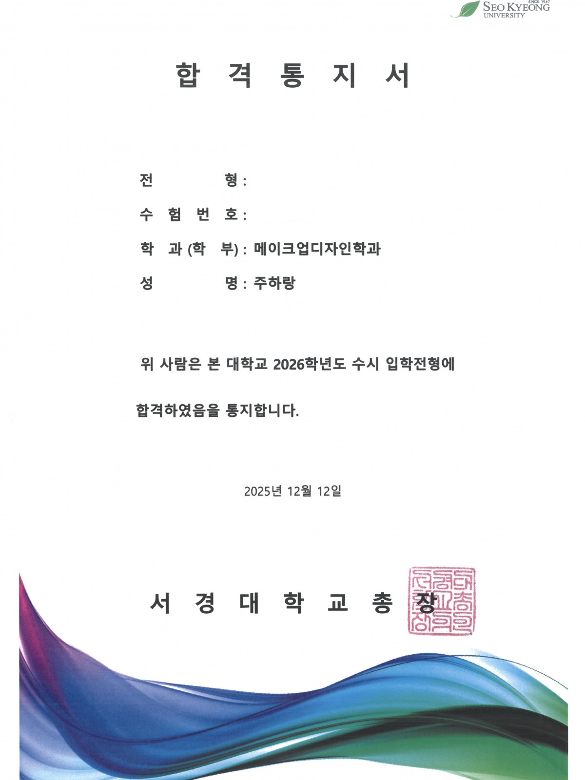 2026학년도 서경대학교 메이크업디자인학과 최종합격 ! 페이지 정보 작성자 김민서강사 작성일25-12-19 11:37 조회21회 댓글0건 관련링크 이전글 목록 본문 순천KBS아트비전미용학원에서 3년연속 서경대학교 합격생을 배출하고있습니다2026학년도 서경대학교 메이크업디자인학과주*랑 학생 최종합격! 이전글 목록