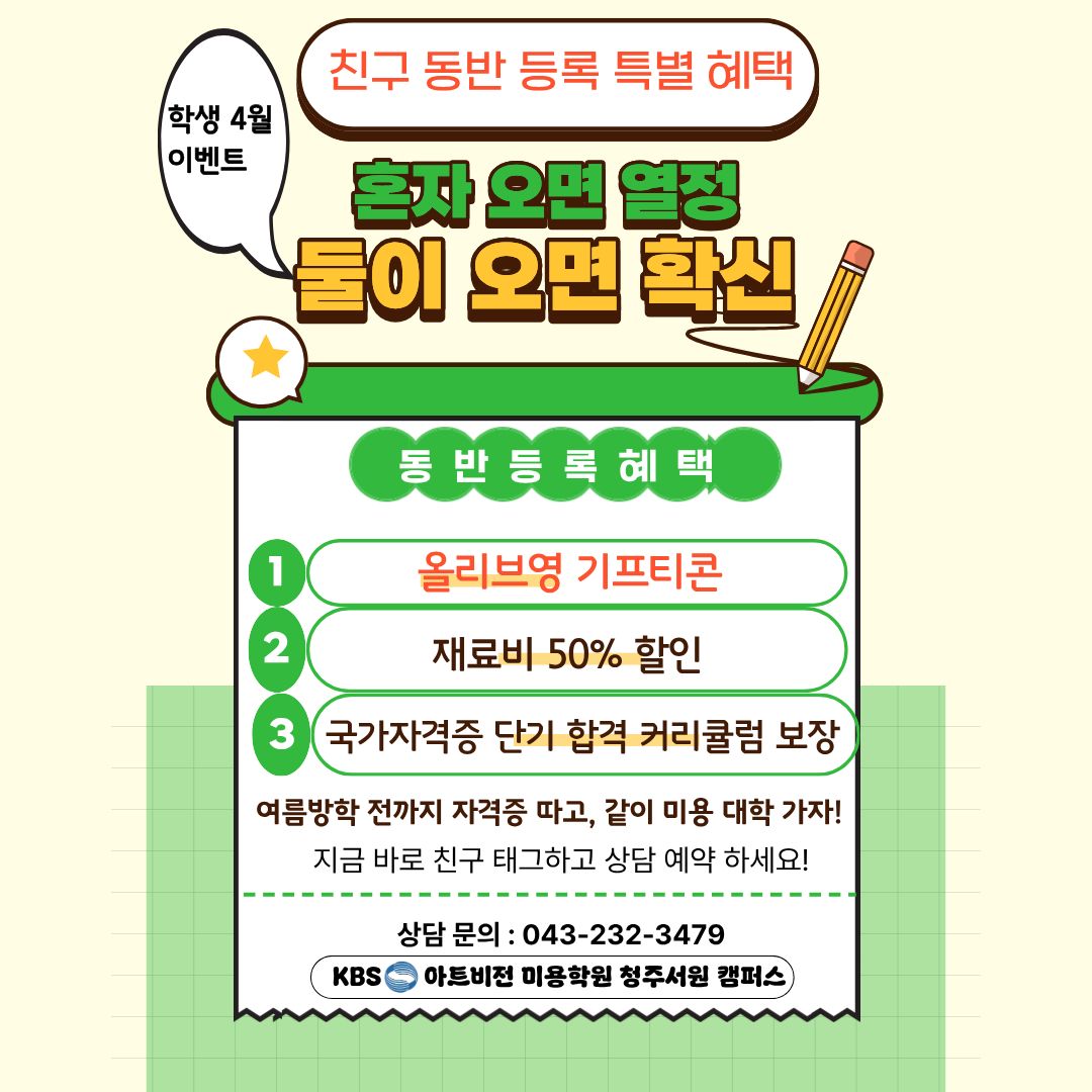 4월 학생 이벤트! 친구 동반 등록 특별 혜택! 페이지 정보 작성자 관리자[청주] 작성일26-04-01 11:02 조회332회 댓글0건 관련링크 이전글 목록 본문 동반 등록 혜택1. 올리브영 기프티콘 제공✔️보상으로 시작의 동기를 확실히 만들어드립니다.2. 재료비 50%할인3. 국가자격증 단기 합격 커리큘럼✔️검증된 교육 시스템으로✔️불필요한 과정 없이 ‘합격’에 집중합니다.■ 이런 분들에게 추천합니다미용을 처음 시작하는 고등학생 ■ 지금이 가장 좋은 타이밍입니다여름방학 전까지 자격증 취득 후미용 대학 진학까지 연결할 수 있는 로드맵을 제공합니다.단순히 배우는 것을 넘어진로까지 설계하는 교육을 경험해 보세요. 이전글 목록
