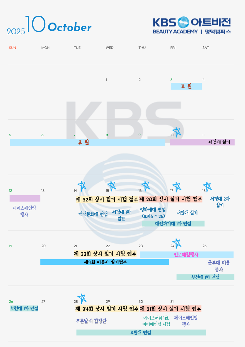 평택 크브스 10월 일정표 공유 페이지 정보 작성자 평택캠퍼스 작성일25-09-26 18:55 조회79회 댓글0건 관련링크 이전글 목록 본문 평택 KBS 10월 일정표 공유합니다. 특이사항은 여기서 확인해 주세요!!궁금하신 내용이 있으시다면 담당 선생님께 연락주세요. 이전글 목록