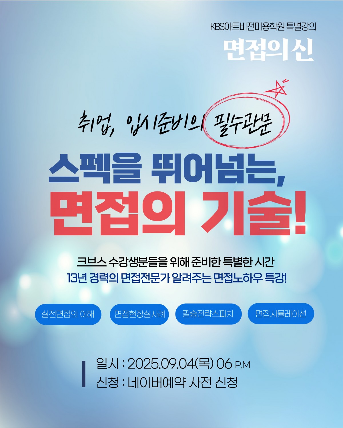 면접이의 신이 알려주는 꿀팁 특강! 페이지 정보 작성자 관리자[천안] 작성일25-08-29 16:25 조회368회 댓글0건 관련링크 이전글 목록 본문 스팩을 뛰어넘는 면접의 기술! 이전글 목록