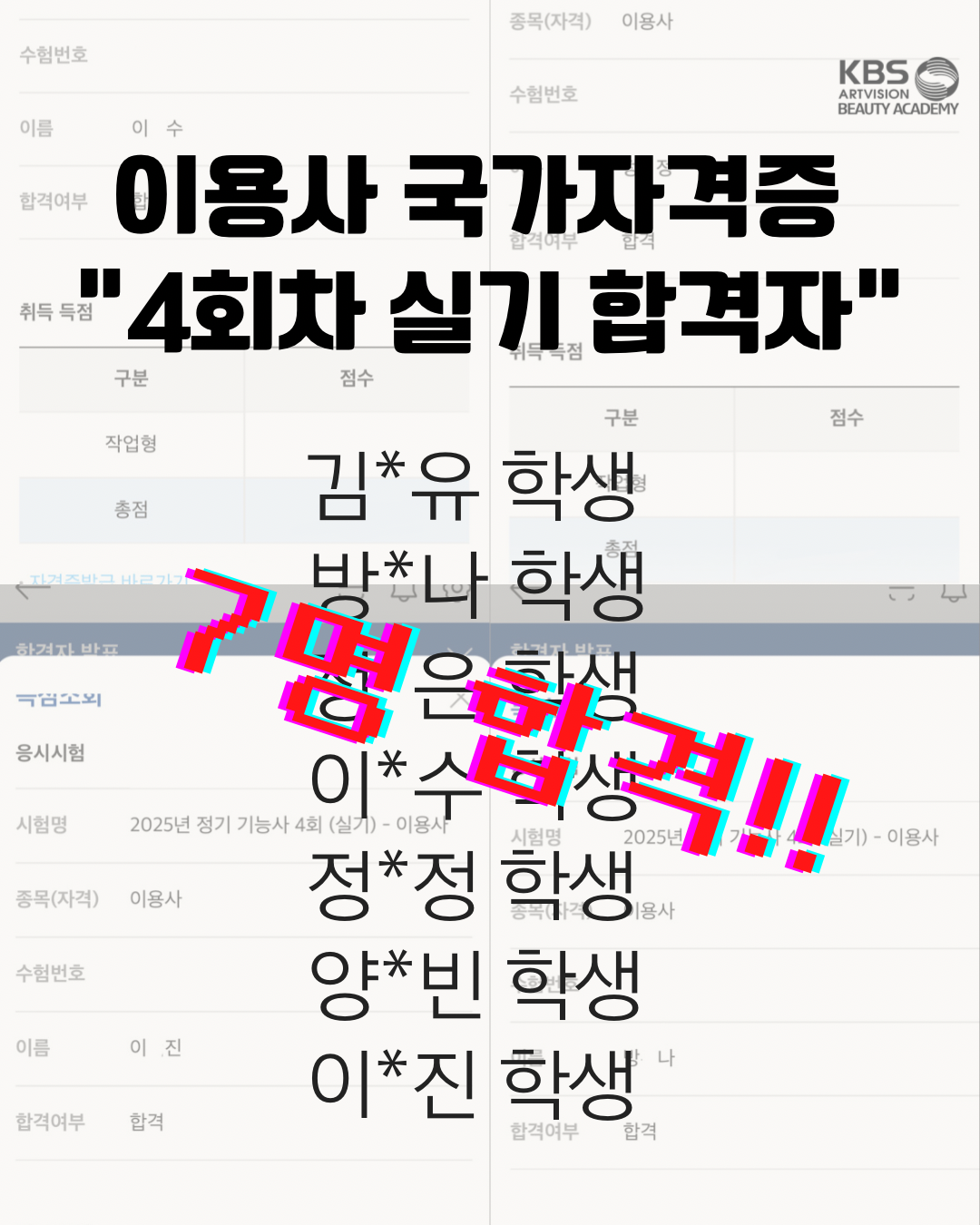 2025년 마지막 4회차이용사국가자격증 7명 합격 ! 페이지 정보 작성자 김민서강사 작성일25-12-19 11:34 조회25회 댓글0건 관련링크 이전글 목록 본문 2025년 이용사국가자격증 마지막 4회차 7명 합격 ! 모두 합격을 축하드립니다✨ 이전글 목록