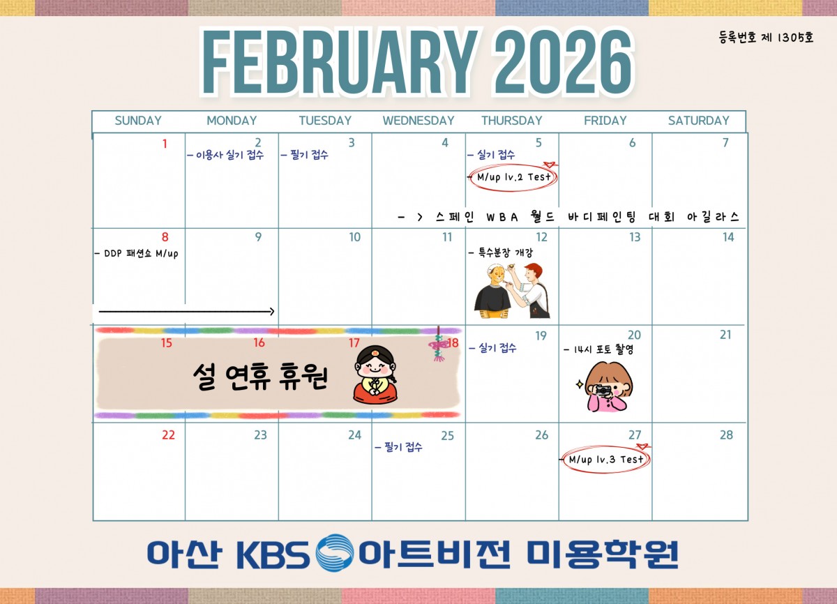 아산 크브스 2월 행사 일정표 페이지 정보 작성자 관리자[아산] 작성일26-01-30 16:41 조회52회 댓글0건 관련링크 이전글 목록 본문 KBS아트비전미용학원 아산캠퍼스 2026.02일정표 공유해드립니당!!~~궁금한 내용은 담당 강사님께 문의해주세요 !!~~ 이전글 목록