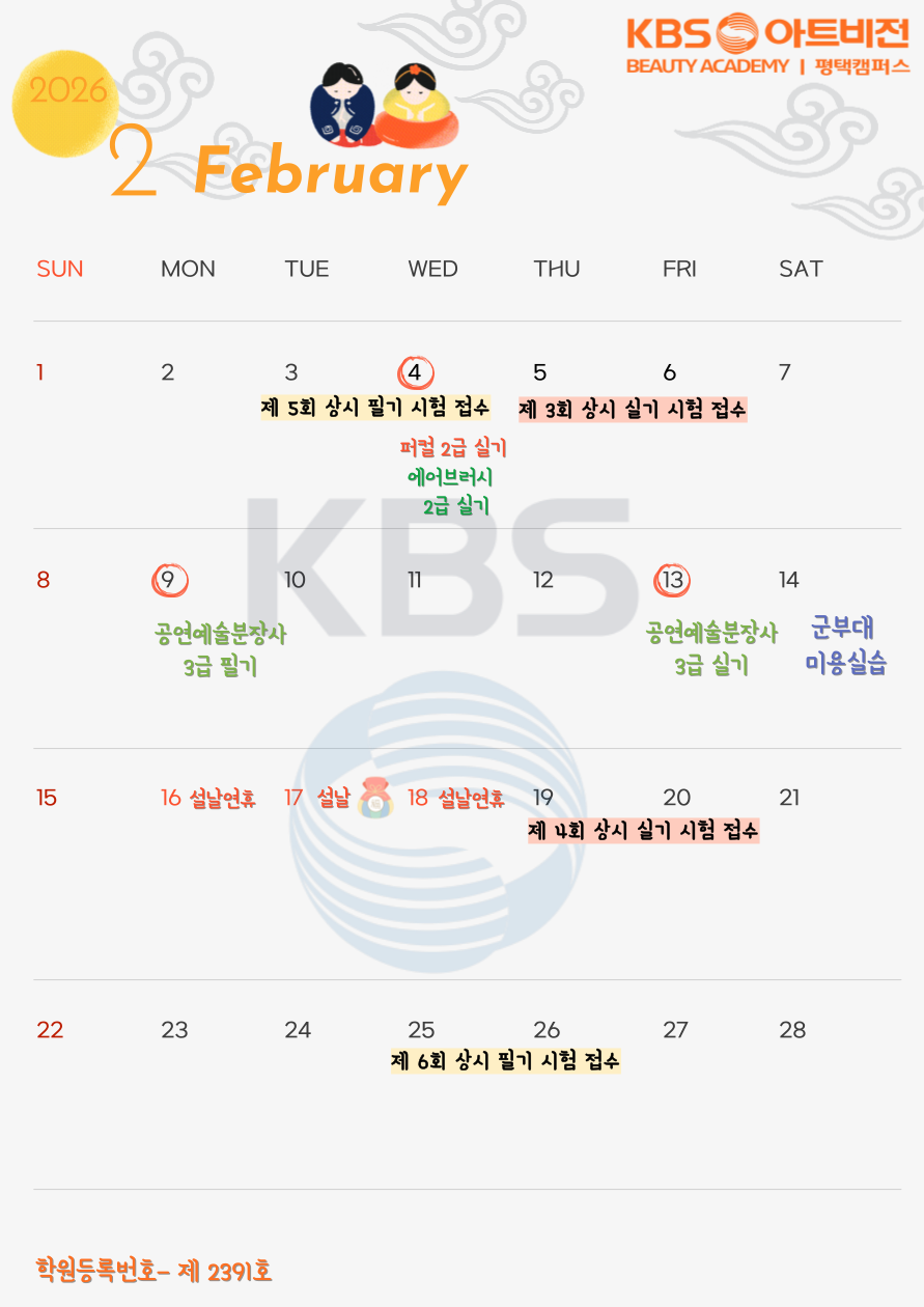 평택 크브스 2월 일정표 페이지 정보 작성자 평택캠퍼스 작성일26-02-02 18:21 조회47회 댓글0건 관련링크 이전글 목록 본문 2월 일정표 입니다!특이사항은 여기서 확인해주시고, 문의는 031-656-0995로 주세요!!학원등록번호 - 제 2391호 이전글 목록