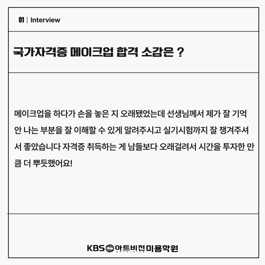 메이크업을 하다가 손을 놓은 지 오래됐었는데 선생님께서 제가 잘 기억 안 나는 부분을 잘 이해할 수 있게 알려주시고 실기시험까지 잘 챙겨주셔서 좋았습니다 자격증 취득하는 게 남들보다 오래걸려서 시간을 투자한 만큼 더 뿌듯했어요!