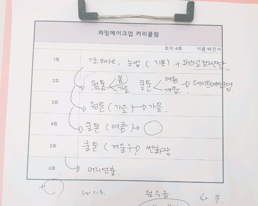 항상 화장할 때마다 친구들한테 문구점 아주머니 화장법이라던 소리를 듣고 고민하고 고민한 끝에 11월 3일 금요일에 상담받았습니다! 사진은 제가 내 얼굴형에 맞는 각 톤을 알아보고자 저렇게 짠 일정표이고 저 일정표는 수강생들이 원하는 화장법에 따라 일정표가 달라진다고 하시더군요~! 즐거운 상담이었고 바로 매주 금요일에 다니기로 했습니다~
